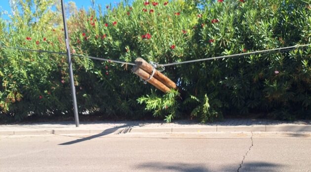 Crollato l’11 settembre, dopo anni e anni di onorato servizio, qui giace sospeso, nell’indifferenza, il glorioso palo della luce (o della Telecom)…