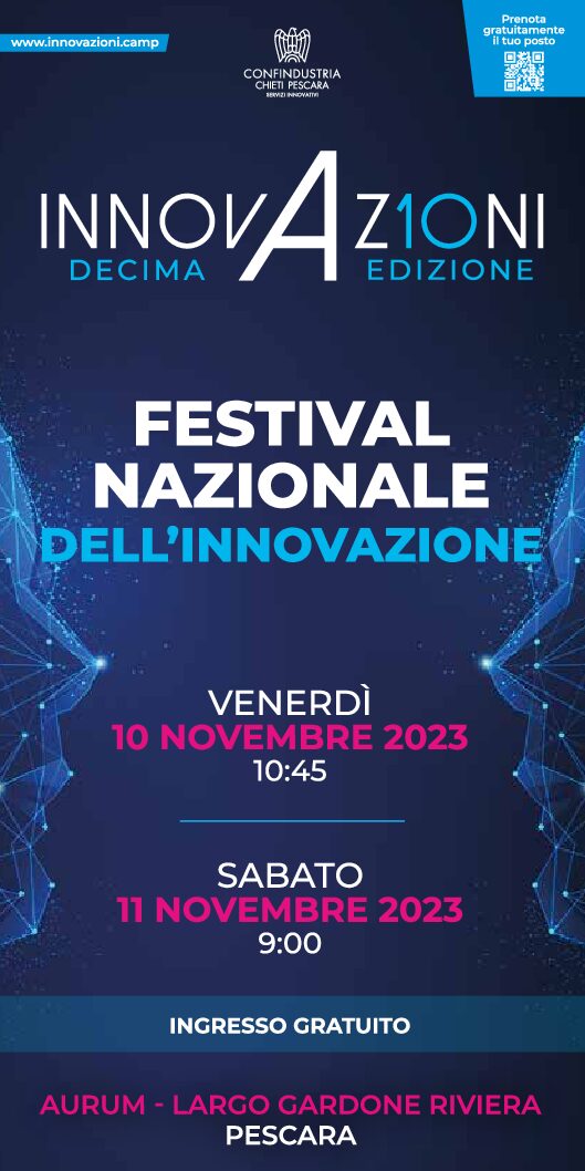 Manca poco allo start. A Pescara (Aurum, largo Gardone Riviera), i prossimi 10 e 11 novembre, si terrà la decima edizione del Festival nazionale dell’Innovazione, promosso dalla sezione Servizi Innovativi di Confindustria Chieti Pescara con il patrocinio, tra gli altri, del Comune di Pescara, di CCIAA Chieti Pescara e di FIRA, Finanziaria Regionale Abruzzese. InnovAzioni di Confindustria Chieti Pescara significa 48 ore dedicate all’innovazione: -gruppi di studenti universitari si sfidano nella gara di idee InnovAtion Hackathon; -PMI, STARTUP e SPINOFF universitari presentano i loro progetti innovativi al contest Campioni di InnovAzioni; -imprenditori, divulgatori scientifici, visionari e testimonial d’eccezione si confrontano sui grandi temi dell’innovazione del presente e del futuro.